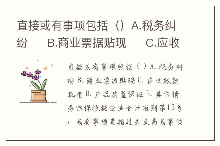 直接或有事项包括()A.税务纠纷 B.商业票据贴现 C.应收账款抵借 D.产品质量保证 E.其它债务担保