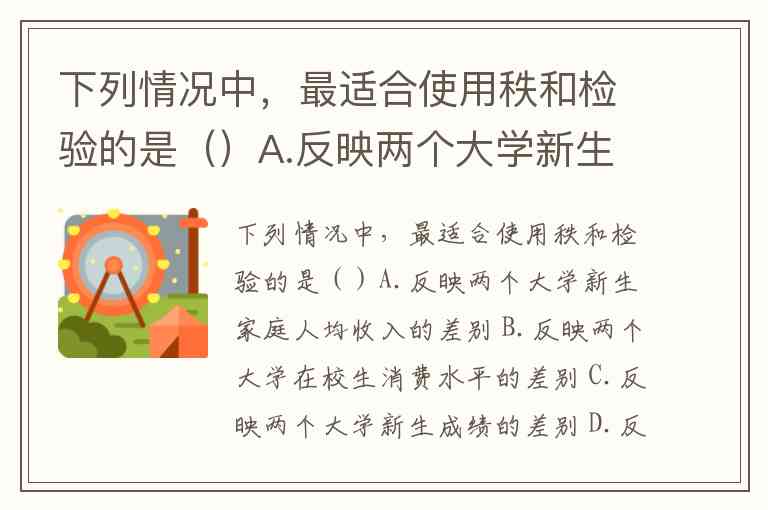 下列情况中,最适合使用秩和检验的是()A.反映两个大学新生家庭人均收入的差别 B.反映两个大学在校生消费水平的差别 C.反映两个大学新生成绩的差别 D.反映两个大学三年级学生对就业前景的看法差别