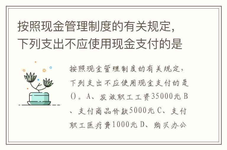 按照现金管理制度的有关规定,下列支出不应使用现金支付的是()。A、发放职工工资35000元 B、支付商品价款5000元 C、支付职工医疗费1000元 D、购买办公用品500元