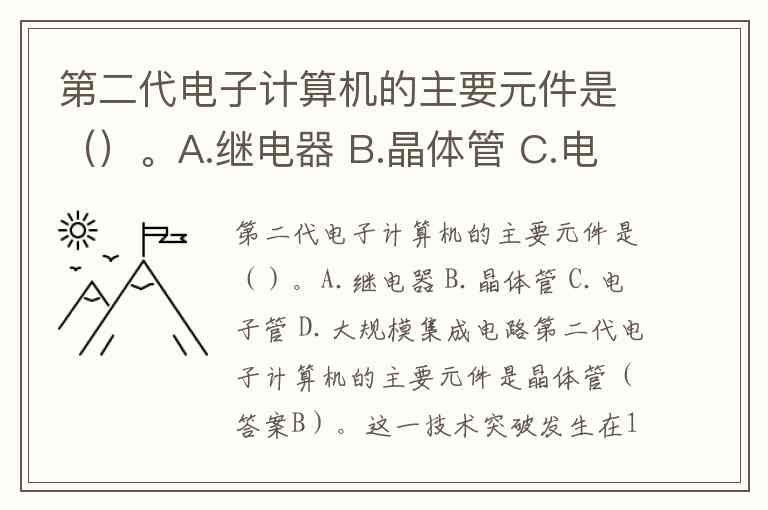 第二代电子计算机的主要元件是()。A.继电器 B.晶体管 C.电子管 D.大规模集成电路