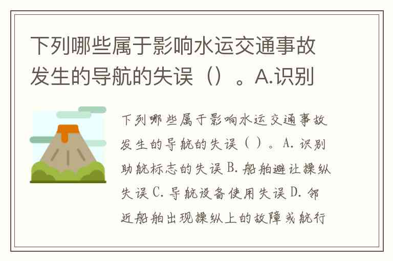 影响水运交通事故的导航失误主要包括船舶操纵、标志识别、设备使用及他船行为等方面的错误判断或操作。根据安全技术规范,具体可分为五大类情形。