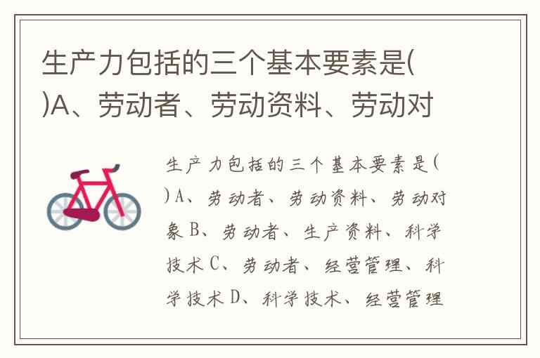 生产力包括的三个基本要素是( )A、劳动者、劳动资料、劳动对象 B、劳动者、生产资料、科学技术 C、劳动者、经营管理、科学技术 D、科学技术、经营管理、经济信息