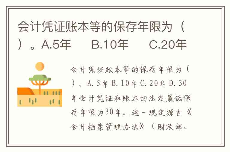 会计凭证账本等的保存年限为()。A.5年 B.10年 C.20年 D.30年