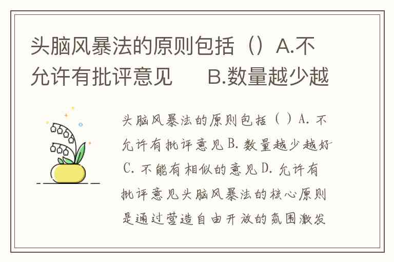 头脑风暴法的原则包括()A.不允许有批评意见 B.数量越少越好 C.不能有相似的意见 D.允许有批评意见