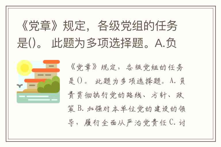《党章》规定,各级党组的任务是()。 此题为多项选择题。A.负责贯彻执行党的路线、方针、政策 B.加强对本单位党的建设的领导,履行全面从严治党责任 C.讨论和决定基层党组织设置调整和发展党员、处分党员等重要事项 D.领导机关和直属单位党组织的工作