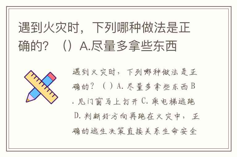遇到火灾时,下列哪种做法是正确的?()A.尽量多拿些东西 B.见门窗马上打开 C.乘电梯逃跑 D.判断好方向再跑