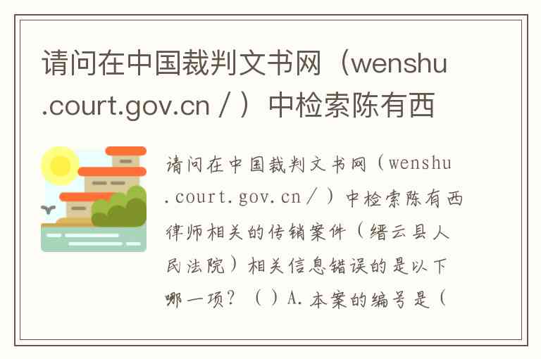 在中国裁判文书网检索缙云县人民法院审理的陈有西律师相关传销案件时,错误的信息是D选项“该案是由陈有西代理”。根据参考文档,该案中陈有西律师并未直接代理案件,而是被告人马某当庭提交了其此前办理的“中国首例电子商务被控传销案”辩护词作为参考。