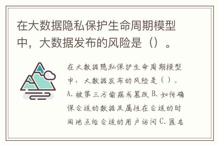 在大数据隐私保护生命周期模型中,大数据发布的风险是()。A.被第三方偷窥或篡改 B.如何确保合适的数据及属性在合适的时间地点给合适的用户访问 C.匿名处理后经过数据挖掘仍可被分析出隐私 D.如何在发布时去掉用户隐私并保证数据可用