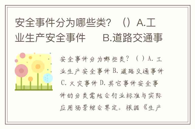 安全事件分为哪些类?()A.工业生产安全事件 B.道路交通事件 C.火灾事件 D.其它事件