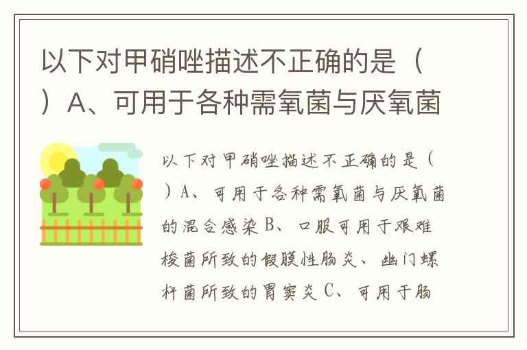 以下对甲硝唑描述不正确的是()A、可用于各种需氧菌与厌氧菌的混合感染 B、口服可用于艰难梭菌所致的假膜性肠炎、幽门螺杆菌所致的胃窦炎 C、可用于肠道及肠外阿米巴病、阴道滴虫病 D、可用于铜绿假单胞菌所致的感染