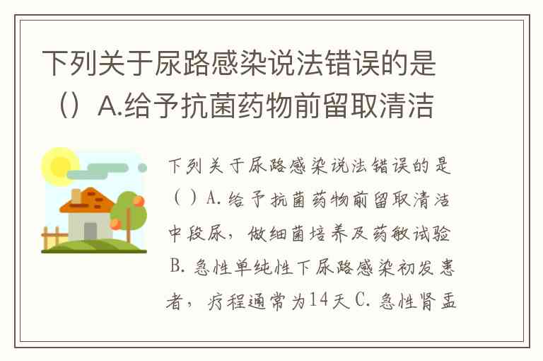 下列关于尿路感染说法错误的是()A.给予抗菌药物前留取清洁中段尿,做细菌培养及药敏试验 B.急性单纯性下尿路感染初发患者,疗程通常为14天 C.急性肾盂肾炎伴发热等全身症状明显的患者宜注射给药,疗程至少14天,一般2~4周 D.反复发作性肾盂肾炎患者疗程需更长,需4~6周 E.对抗菌药物治疗无效的患者应进行全面尿路系统检查,若发现尿路解剖畸形或功能异常者,应予以矫正或相应处理