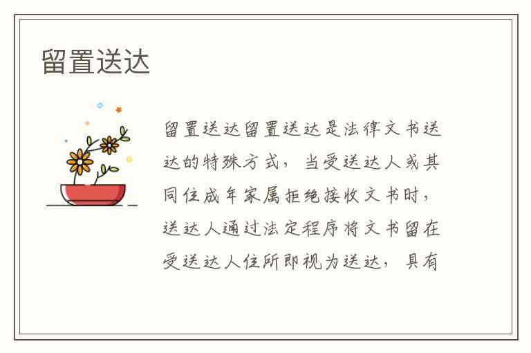 留置送达是法律文书送达的特殊方式,当受送达人或其同住成年家属拒绝接收文书时,送达人通过法定程序将文书留在受送达人住所即视为送达,具有与直接送达同等的法律效力。这种带有强制性的送达方式,既保障了诉讼程序推进,又避免因当事人拒收导致司法程序停滞。