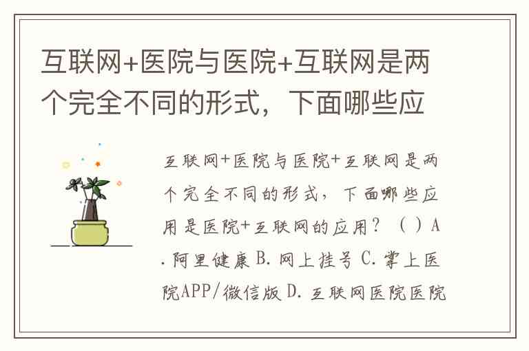 互联网+医院与医院+互联网是两个完全不同的形式,下面哪些应用是医院+互联网的应用?()A.阿里健康 B.网上挂号 C.掌上医院APP/微信版 D.互联网医院