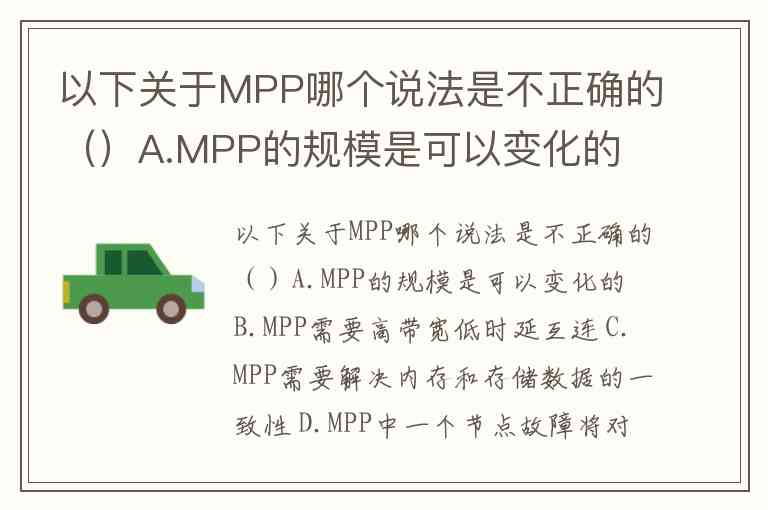 以下关于MPP哪个说法是不正确的()A.MPP的规模是可以变化的 B.MPP需要高带宽低时延互连 C.MPP需要解决内存和存储数据的一致性 D.MPP中一个节点故障将对整个系统带来重大影响