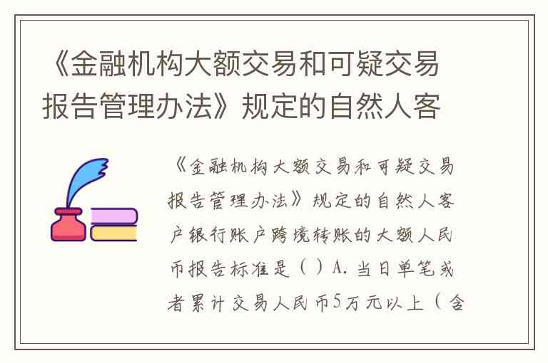 《金融机构大额交易和可疑交易报告管理办法》规定的自然人客户银行账户跨境转账的大额人民币报告标准是()A.当日单笔或者累计交易人民币5万元以上(含5万元)的款项划转 B.当日单笔或者累计交易人民币10万元以上(含10万元)的款项划转 C.当日单笔或者累计交易人民币20万元以上(含20万元)的跨境款项划转