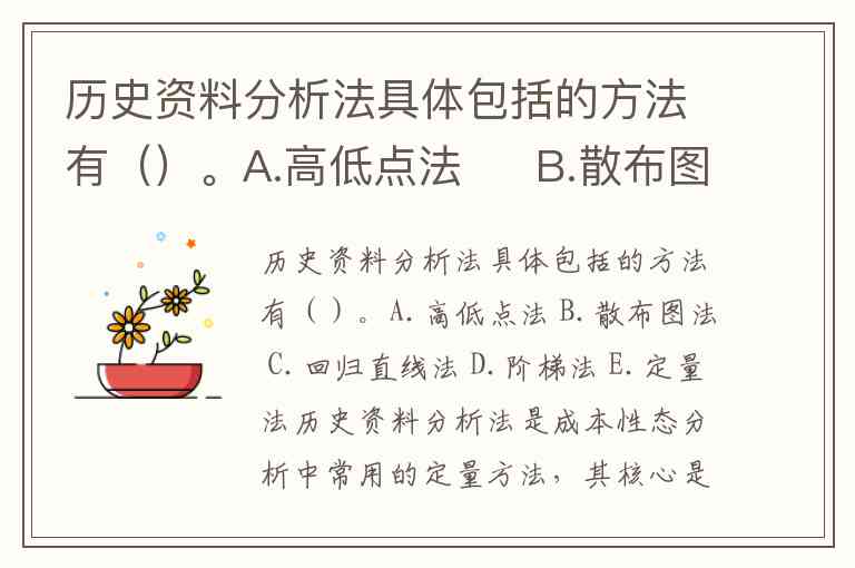 历史资料分析法是成本性态分析中常用的定量方法,其核心是通过数学处理历史成本与业务量数据,分解混合成本中的固定部分与变动部分。根据多份权威资料,该方法具体包括高低点法、散布图法和回归直线法三种。
