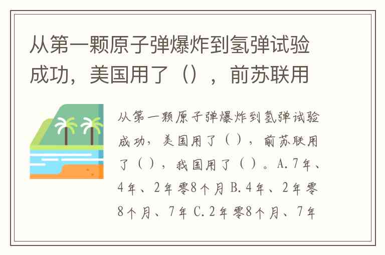 从第一颗原子弹爆炸到氢弹试验成功,美国用了(),前苏联用了(),我国用了()。A.7年、4年、2年零8个月 B.4年、2年零8个月、7年 C.2年零8个月、7年、4年