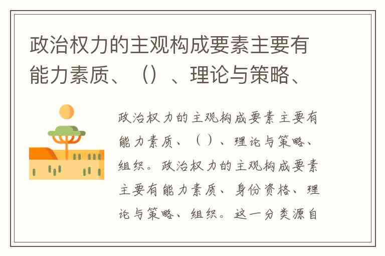 政治权力的主观构成要素主要有能力素质、身份资格、理论与策略、组织。这一分类源自对权力主体自身条件的系统性分析,其中身份资格既包括个人的资历、职位、威望或继承资格,也涵盖群体的社会形象、地位及政治声誉,是权力合法性与影响力的重要载体。