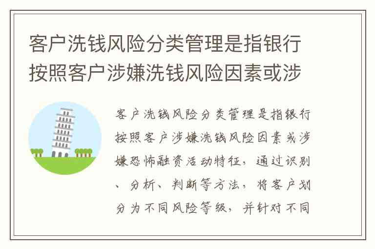 客户洗钱风险分类管理是指银行按照客户涉嫌洗钱风险因素或涉嫌恐怖融资活动特征,通过识别、分析、判断等方法,将客户划分为不同风险等级,并针对不同风险等级制定和采取不同措施的过程。