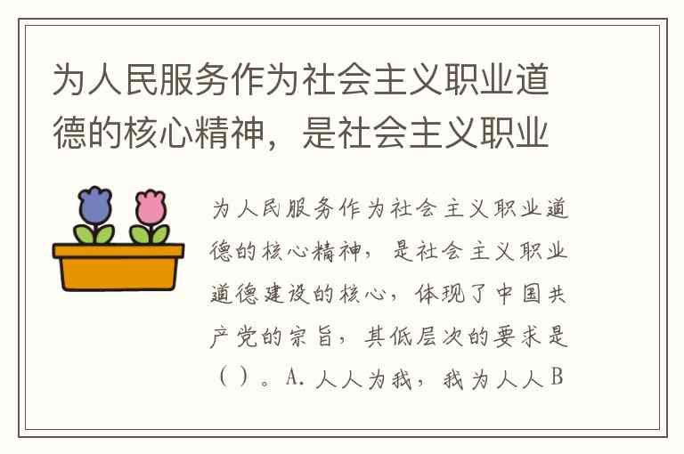 为人民服务作为社会主义职业道德的核心精神,是社会主义职业道德建设的核心,体现了中国共产党的宗旨,其低层次的要求是()。A.人人为我,我为人人 B.为人民服务 C.人人为党 D.坚持集体主义