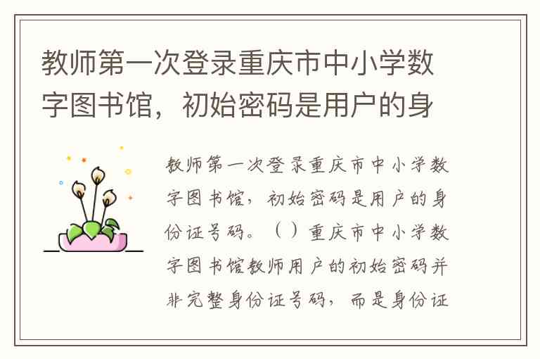 重庆市中小学数字图书馆教师用户的初始密码并非完整身份证号码,而是身份证号码后6位。根据最新指引,教师首次登录时,用户名可选择教师继续教育号或身份证号码,对应的初始密码统一为身份证号码的最后6位数字,登录后应及时修改密码以保障账户安全。这一设置与2019年的说明一致,体现了密码规则的稳定性。
