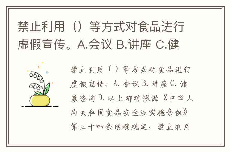 禁止利用()等方式对食品进行虚假宣传。A.会议 B.讲座 C.健康咨询 D.以上都对