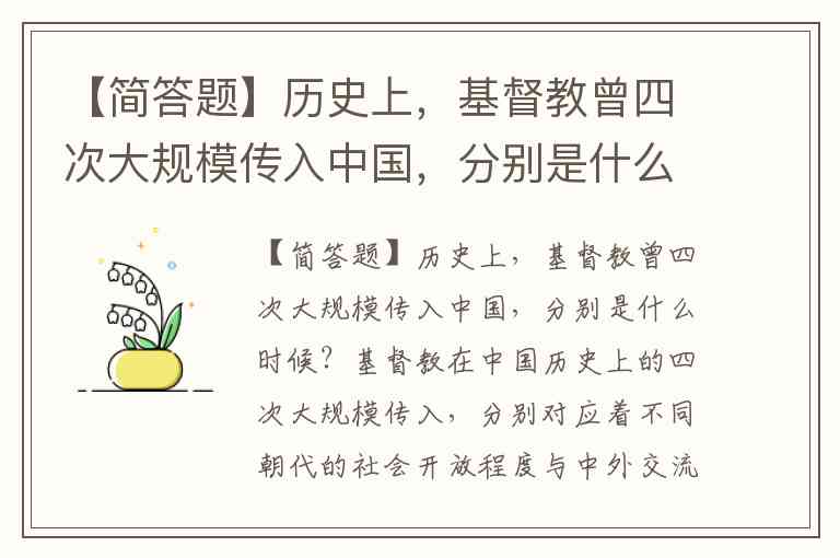基督教在中国历史上的四次大规模传入,分别对应着不同朝代的社会开放程度与中外交流特征:
