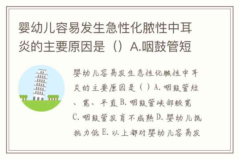 婴幼儿容易发生急性化脓性中耳炎的主要原因是()A.咽鼓管短、宽、平直 B.咽鼓管峡部较宽 C.咽鼓管发育不成熟 D.婴幼儿抵抗力低 E.以上都对