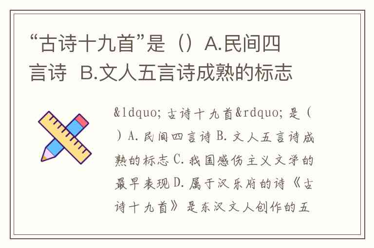“古诗十九首”是()A.民间四言诗 B.文人五言诗成熟的标志 C.我国感伤主义文学的最早表现 D.属于汉乐府的诗