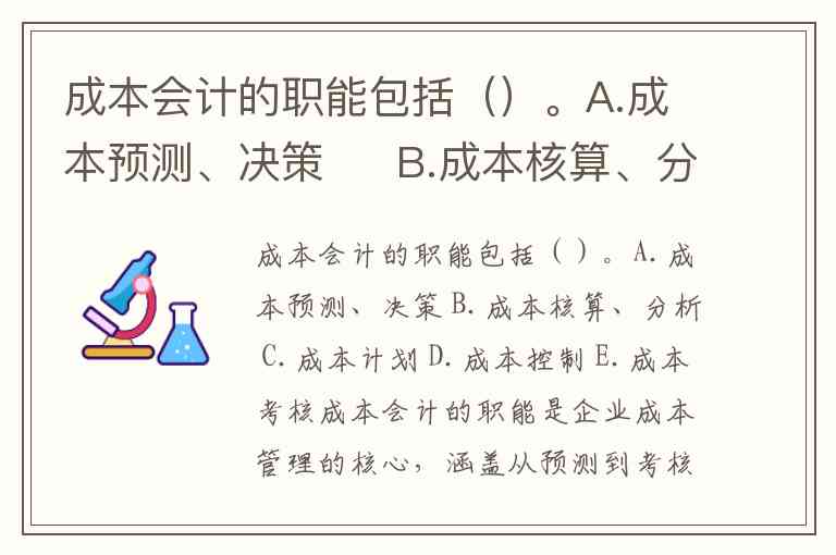 成本会计的职能包括()。A.成本预测、决策 B.成本核算、分析 C.成本计划 D.成本控制 E.成本考核