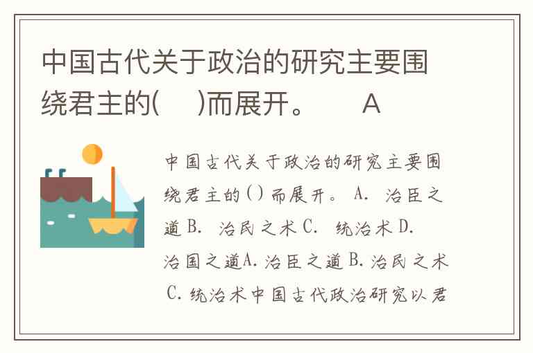 中国古代关于政治的研究主要围绕君主的( )而展开。 A.治臣之道 B.治民之术 C.统治术 D.治国之道A.治臣之道 B.治民之术 C.统治术