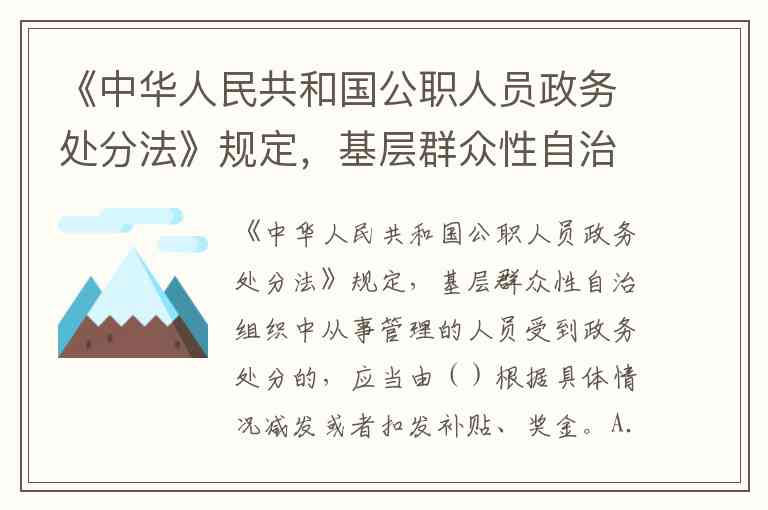 《中华人民共和国公职人员政务处分法》规定,基层群众性自治组织中从事管理的人员受到政务处分的,应当由()根据具体情况减发或者扣发补贴、奖金。A.县级人民政府 B.乡镇人民政府 C.县级或者乡镇人事部门 D.县级或者乡镇人民政府