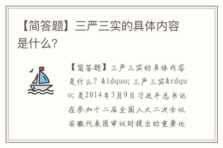 “三严三实”是2014年3月9日习近平总书记在参加十二届全国人大二次会议安徽代表团审议时提出的重要论述。“三严”指严以修身、严以用权、严以律己,“三实”指谋事要实、创业要实、做人要实,是党员干部修身之本、为政之道、成事之要。