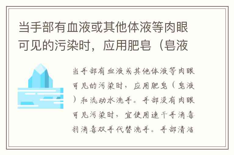 当手部有血液或其他体液等肉眼可见的污染时,应用肥皂(皂液)和流动水洗手。手部没有肉眼可见污染时,宜使用速干手消毒剂消毒双手代替洗手。