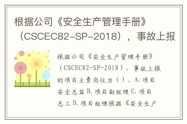 根据公司《安全生产管理手册》(CSCEC82-SP-2018),事故上报的项目主责岗位为()。A.项目安全总监 B.项目副经理 C.项目总工 D.项目经理