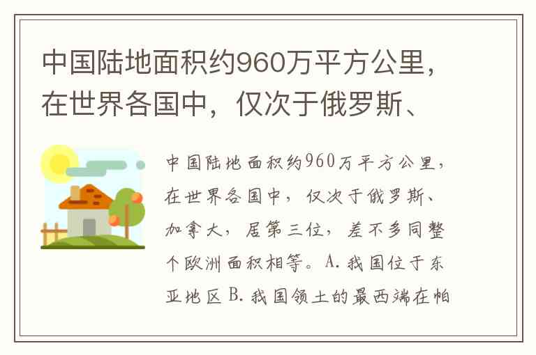 中国陆地面积约960万平方公里,在世界各国中,仅次于俄罗斯、加拿大,居第三位,差不多同整个欧洲面积相等。A.我国位于东亚地区 B.我国领土的最西端在帕米尔高原,最南端在海南岛 C.我国位于亚欧大陆的西部,太平洋的西侧 D.我国所跨纬度较广,地处寒温热三带