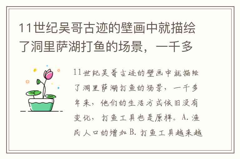 11世纪吴哥古迹的壁画中就描绘了洞里萨湖打鱼的场景,一千多年来,他们的生活方式依旧没有变化,打鱼工具也是原样。A.渔民人口的增加 B.打鱼工具越来越先进,使得鱼越来越少 C.鱼鹰不抓鱼 D.政府规定了禁渔期