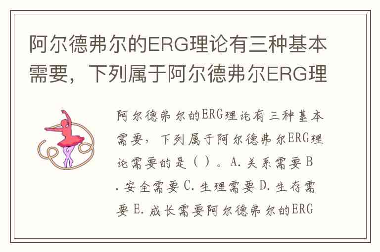 阿尔德弗尔的ERG理论有三种基本需要,下列属于阿尔德弗尔ERG理论需要的是()。A.关系需要 B.安全需要 C.生理需要 D.生存需要 E.成长需要