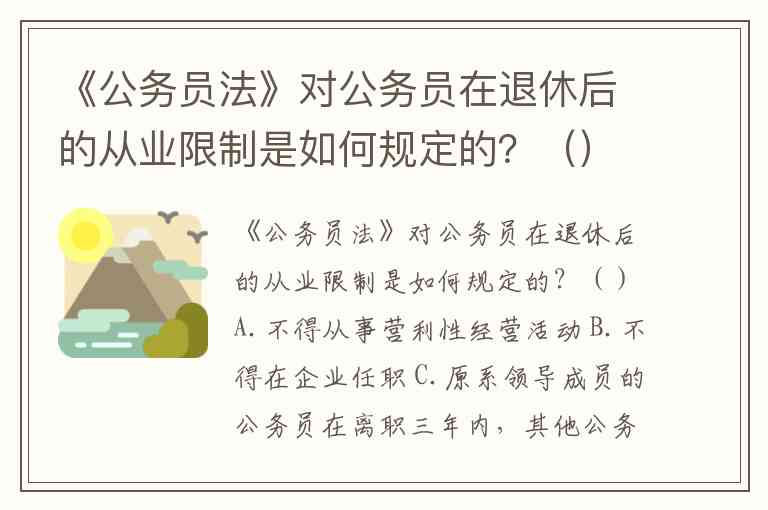 《公务员法》对公务员在退休后的从业限制是如何规定的?()A.不得从事营利性经营活动 B.不得在企业任职 C.原系领导成员的公务员在离职三年内,其他公务员在离职两年内不得到原工作业务直接相关的企业或其他营利性组织任职 D.不得从事与原工作业务直接相关的活动