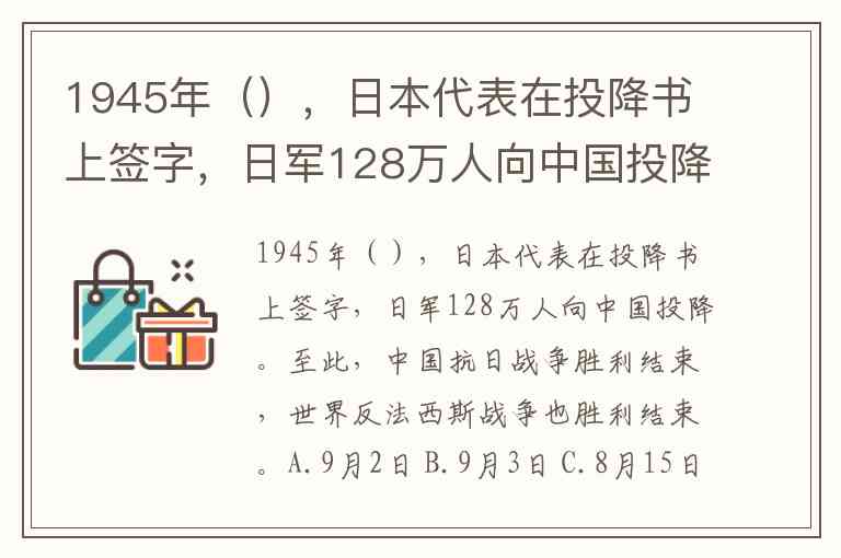 1945年(),日本代表在投降书上签字,日军128万人向中国投降。至此,中国抗日战争胜利结束,世界反法西斯战争也胜利结束。A.9月2日 B.9月3日 C.8月15日 D.8月16日
