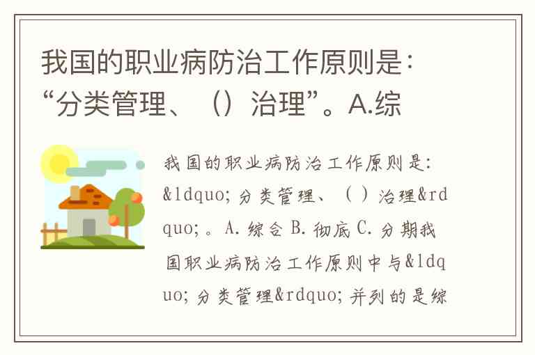 我国的职业病防治工作原则是:“分类管理、()治理”。A.综合 B.彻底 C.分期