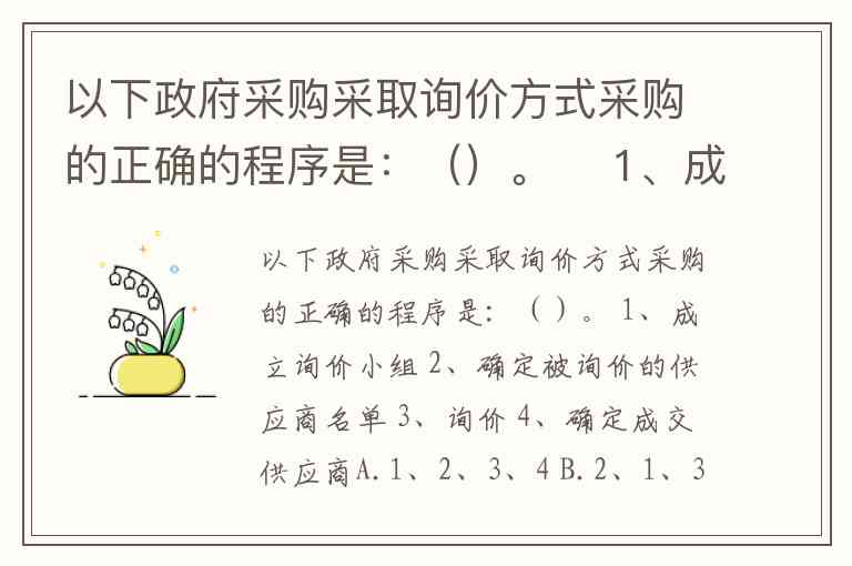 以下政府采购采取询价方式采购的正确的程序是:()。 1、成立询价小组 2、确定被询价的供应商名单 3、询价 4、确定成交供应商A.1、2、3、4 B.2、1、3、4 C.3、2、1、4 D.2、3、1、4