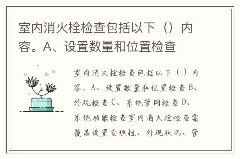 室内消火栓检查包括以下()内容。A、设置数量和位置检查 B、外观检查 C、系统管网检查 D、系统功能检查