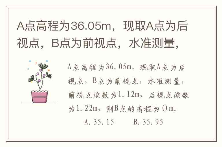 A点高程为36.05m,现取A点为后视点,B点为前视点,水准测量,前视点读数为1.l2m,后视点读数为1.22m,则B点的高程为()m。 A.35.15 B.35.95 C.36.15 D.36.95A.05m,现取A点为后视点,B点为前视点,水准测量,前视点读数为1.l2m,后视点读数为1.22m,则B点的高程为()m。 B.35.15 C.35.95 D.36.15 E.36.95