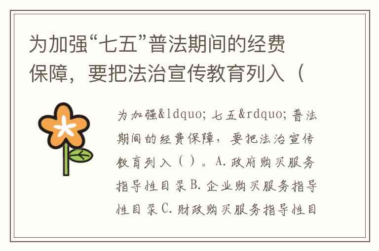 为加强“七五”普法期间的经费保障,要把法治宣传教育列入()。A.政府购买服务指导性目录 B.企业购买服务指导性目录 C.财政购买服务指导性目录 D.事业单位购买服务指导性目录