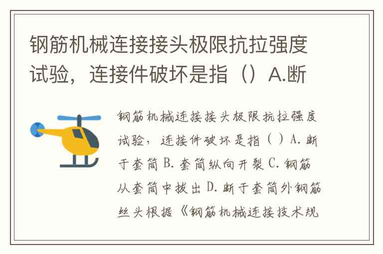 钢筋机械连接接头极限抗拉强度试验,连接件破坏是指()A.断于套筒 B.套筒纵向开裂 C.钢筋从套筒中拔出 D.断于套筒外钢筋丝头