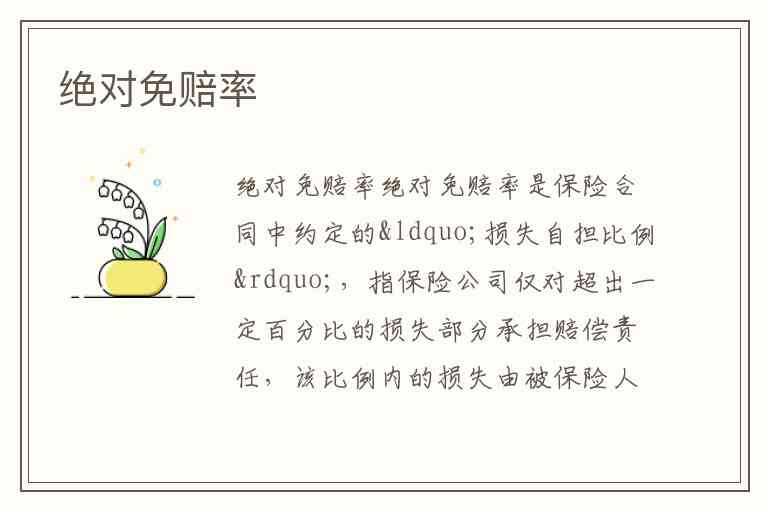 绝对免赔率:仅赔付超出比例的部分。如损失3000元,绝对免赔率10%,则赔付2700元(3000-3000×10%)。