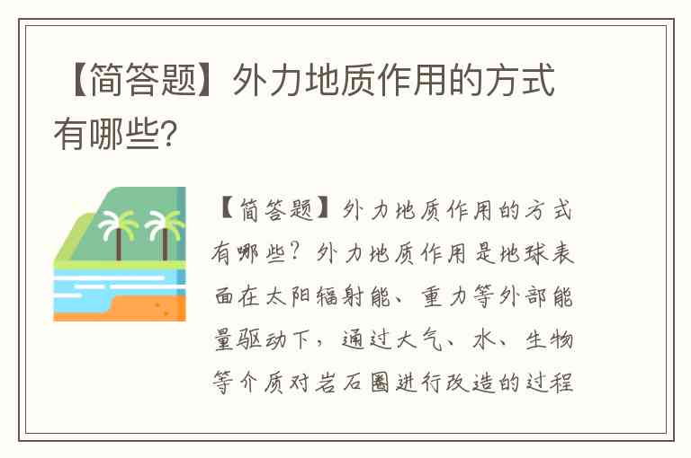 外力地质作用是地球表面在太阳辐射能、重力等外部能量驱动下,通过大气、水、生物等介质对岩石圈进行改造的过程,主要表现为风化、侵蚀、搬运、沉积和固结成岩五种相互关联的方式,它们共同塑造了地表的多样地貌。