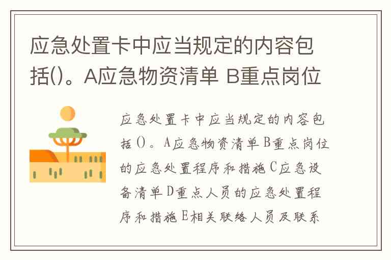应急处置卡中应当规定的内容包括()。A应急物资清单 B重点岗位的应急处置程序和措施 C应急设备清单 D重点人员的应急处置程序和措施 E相关联络人员及联系方式 此题为多项选择题。