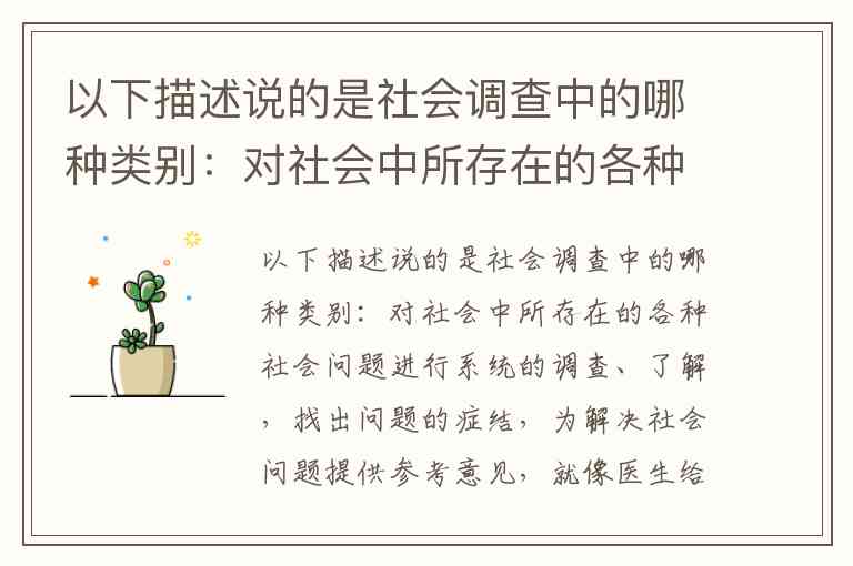 以下描述说的是社会调查中的哪种类别:对社会中所存在的各种社会问题进行系统的调查、了解,找出问题的症结,为解决社会问题提供参考意见,就像医生给病人看病一样,对各种社会问题进行“社会诊断”。()A.生活状况调查 B.社会问题调查 C.民意调查 D.市场调查